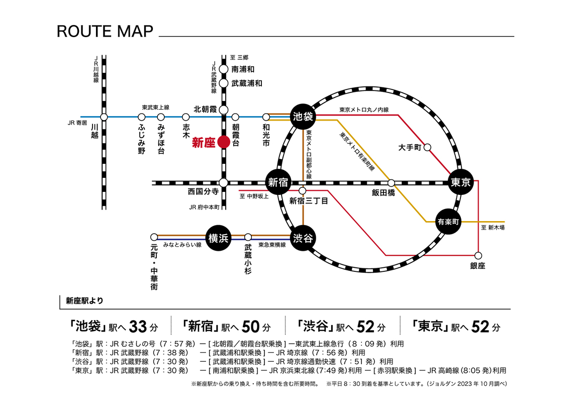 - JR武蔵野線「新座」駅 徒歩15分東武東上線「柳瀬川」駅 徒歩33分東武東上線「志木」駅 徒歩35分
