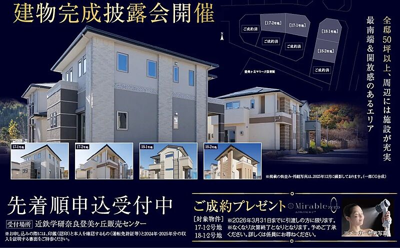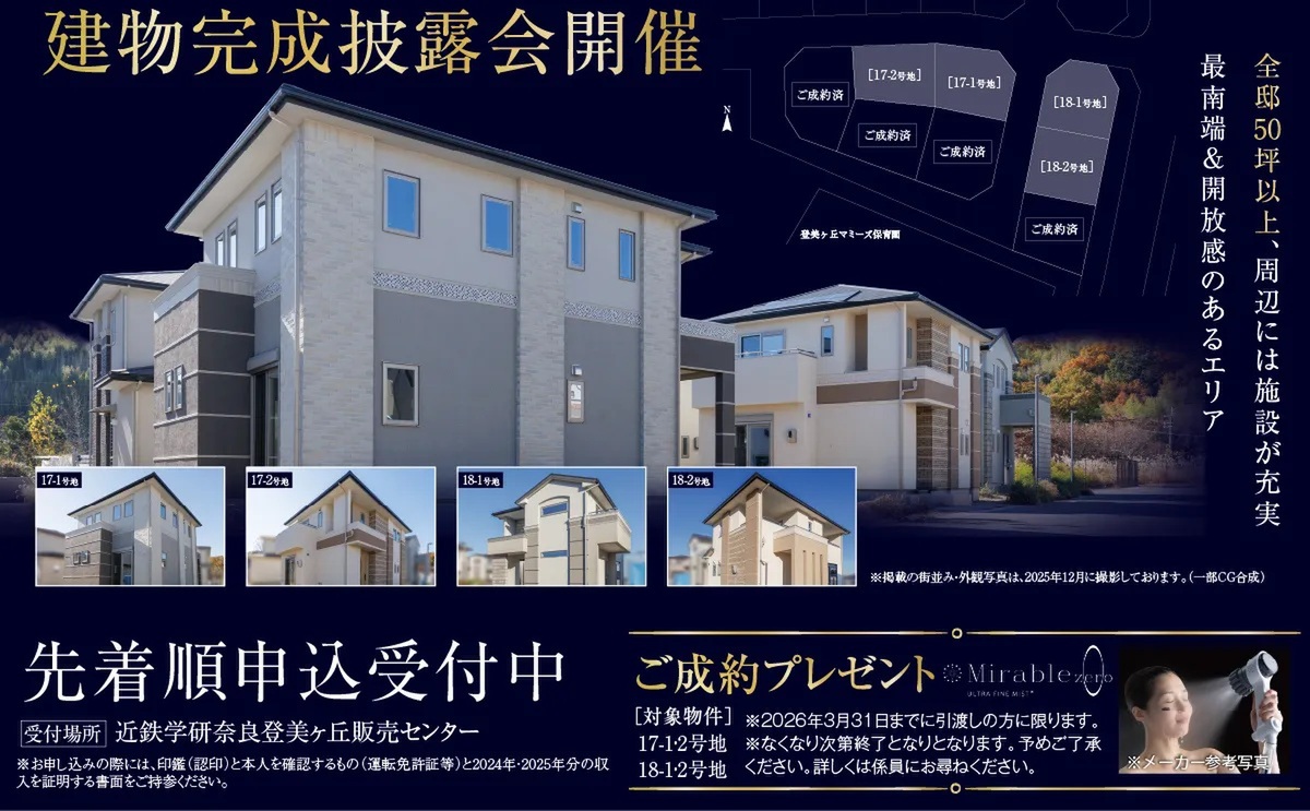 ■新年! 1月10日(土)より 始発駅前の街、いよいよ『semi FINAL』ファイナル 新規分譲もラスト2期を残すだけ! ■建物完成披露会いよいよ開催! 【先着順申込受付中】 ■semi FINALフェア同時開催! 100万円相当家具付モデルハウス分譲!【限定2邸】 先着順申込受付開始 ※詳しくはご来場時にスタッフにお尋ね下さい。 年末年始休業のご案内 2025年12月27日(土)~2026年1月4日(日)は 休業させていただきます。 5日(月)より通常どおり営業いたします。 ◆分譲住宅は個性豊かな建物外観 &プランの物件を多数ご用意しております。 ◆分譲価格には、 土地・建物・外構工事・消費税等を含んでいます。 ◆売主につき、仲介手数料は不要です。 【ご来場ご希望の方は、事前にご予約頂きますようお願いいたします。】 定休日:水曜・木曜、第3火曜日 営業時間:午前10時~午後5時 先進のスマート製品が体感できる、 モデルハウス公開予定! ■エネファーム ■太陽光発電システム *販売期により仕様が異なります。 ご来場&ご成約特典満載! HOME’S特別企画! 【ご来場予約特典】 HOME’Sから来場予約頂くと、 アマゾンギフト3000円分をプレゼント中! この機会をお見逃しなく、ご予約&ご来場下さい♪ 皆様のご来場、心よりお待ち申し上げております。 何かご不明な点がございましたら、ご遠慮なく、 近鉄不動産(株) 登美ヶ丘販売センター 0120-924-102 までお問い合わせ下さい。 |