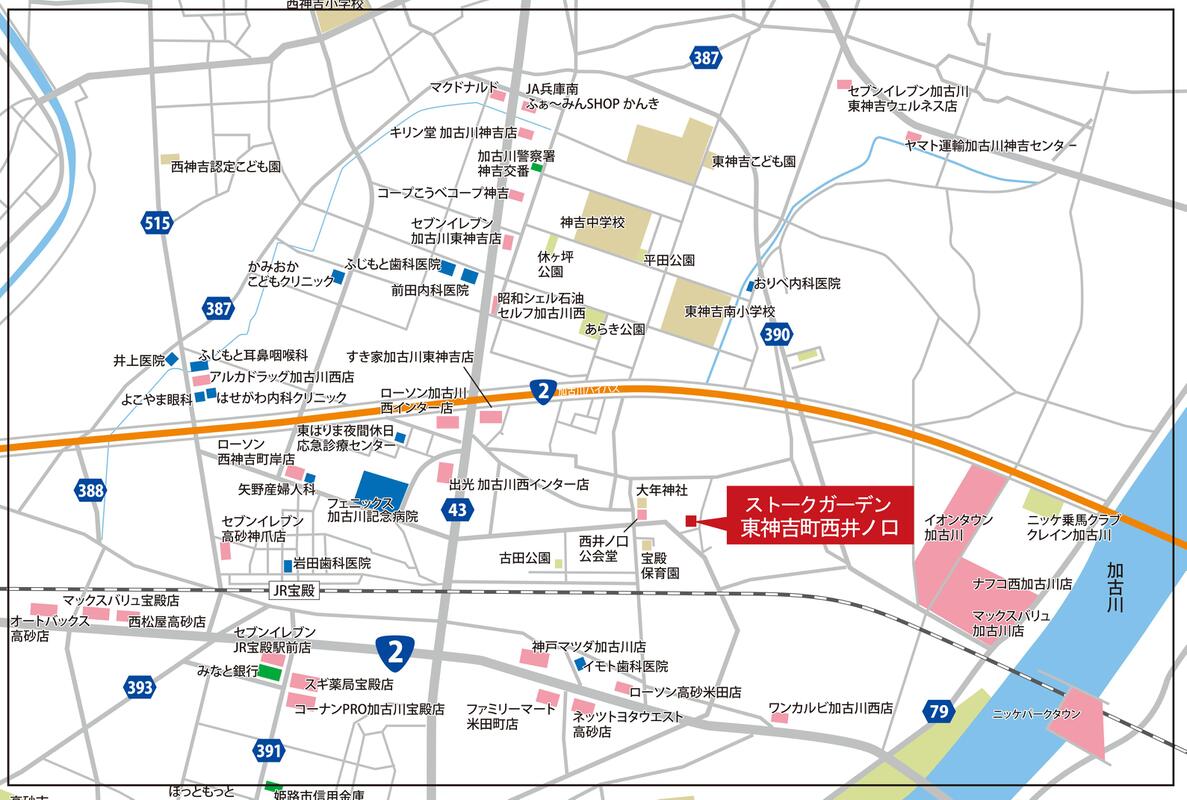 宝殿保育園まで約287~302m(徒歩4分)、東神吉南小学校まで約915~930イオンタウン加古川まで約1,000~1,015m(徒歩13分)と、買い物施設、病院などの生活施設が充実した利便性も抜群!