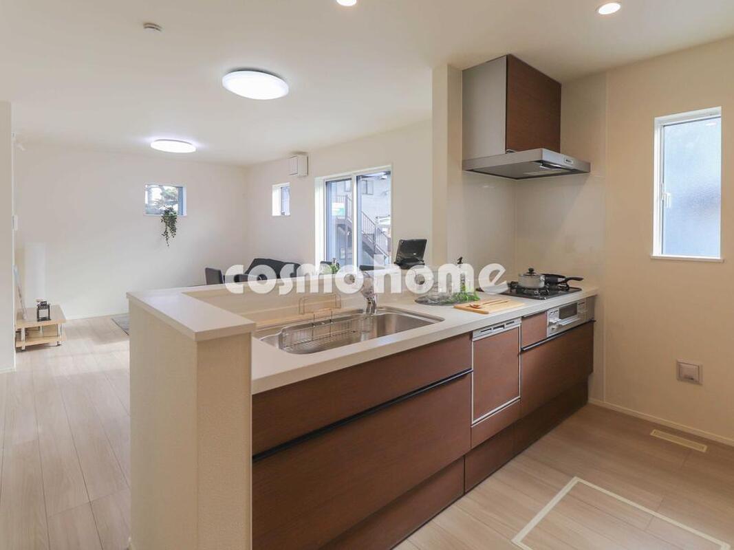 人造大理石ワークトップを採用した高品質システムキッチン。傷や汚れに強く、美しさを長く保ちます。3口ガスコンロで調理もスムーズ!さらに食洗機付きで毎日の暮らしに快適さをプラス♪