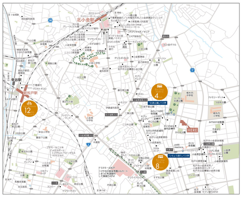JR常磐線「北小金」駅 バス15分 交通公園バス停 徒歩4分 JR武蔵野線「新松戸」駅 徒歩31分~32分 京成松戸線「八柱」駅 バス12分 いちょう通りバス停 徒歩8分 |