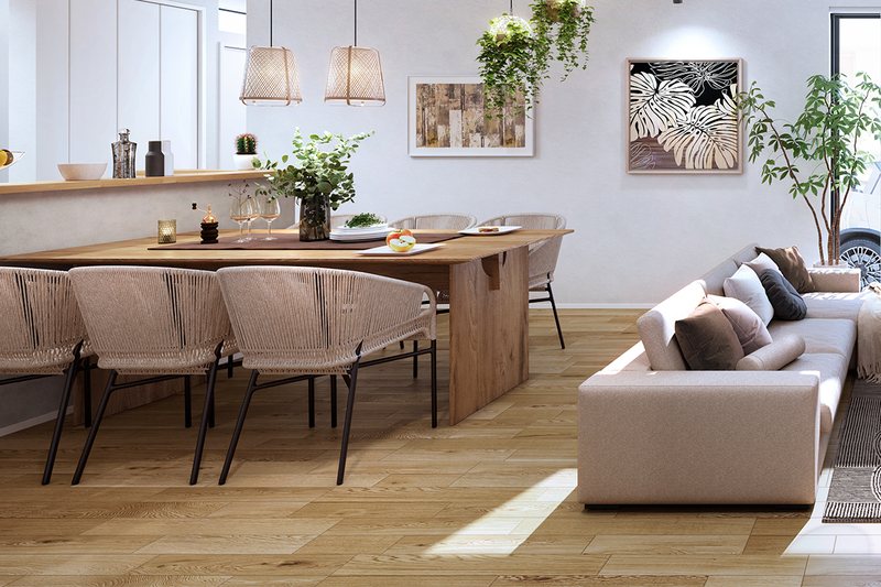リビングの一角に天然木のフロアを貼り上げたデザインを採用。木の...