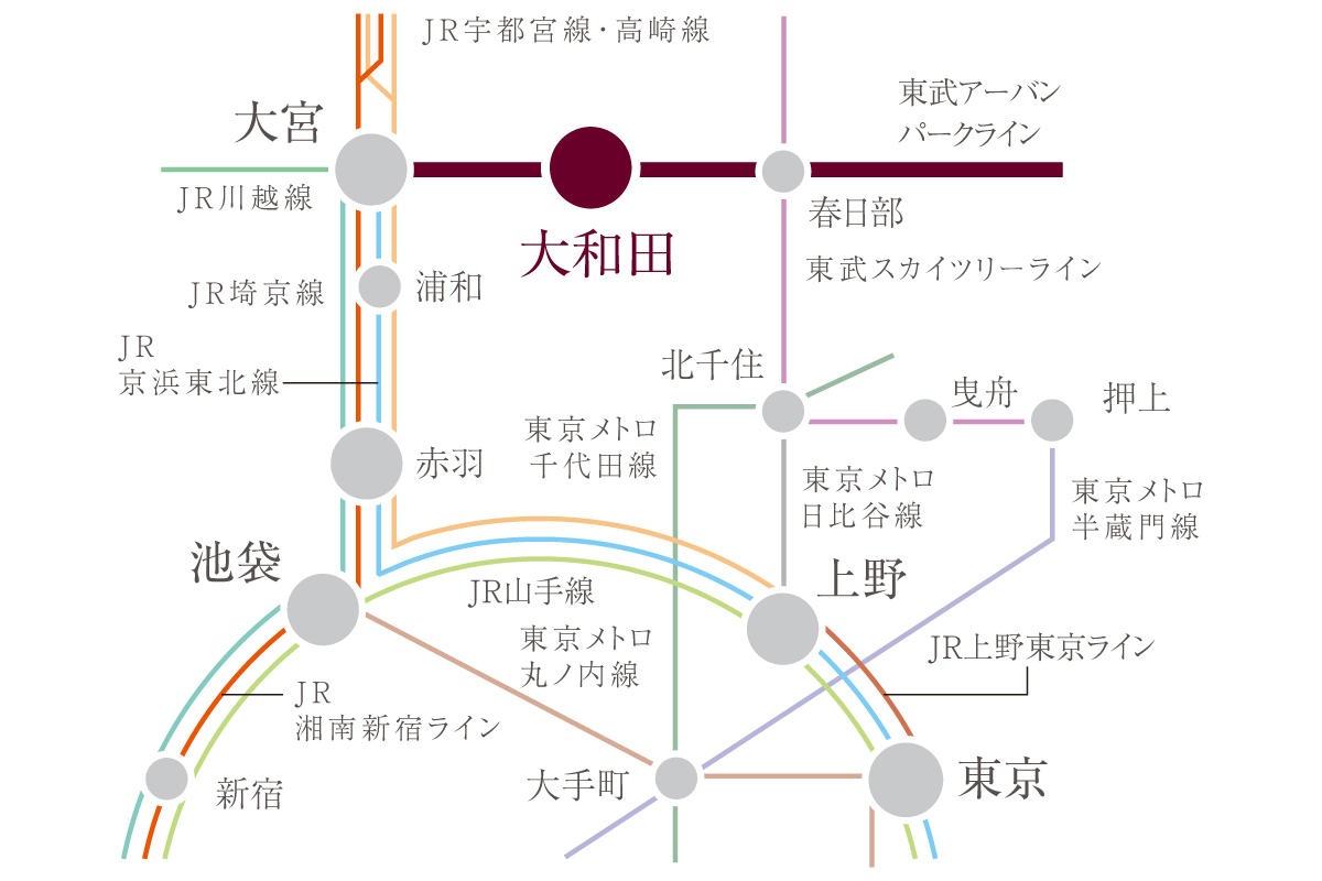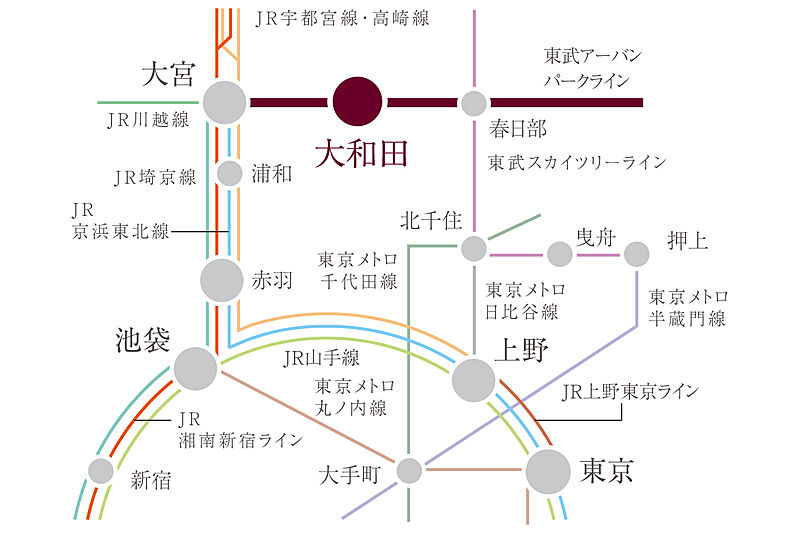 東武アーバンパークライン「大和田」駅から「大宮」駅へ直通6分、「池袋」駅へ39分、「上野」駅へ40分、「東京」駅へ46で到着。都心への通勤通学を負担なく叶えることができます。※電車の所要時間は乗換・待ち時間を含みます。