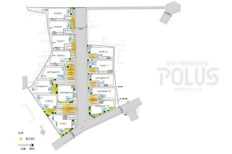 街の中心を通る6m道路に加え、1m以上のセットバックを確保。道路を中心に風の通り道や陽だまり空間を創出し、歩きたくなる明るい街を演出します。