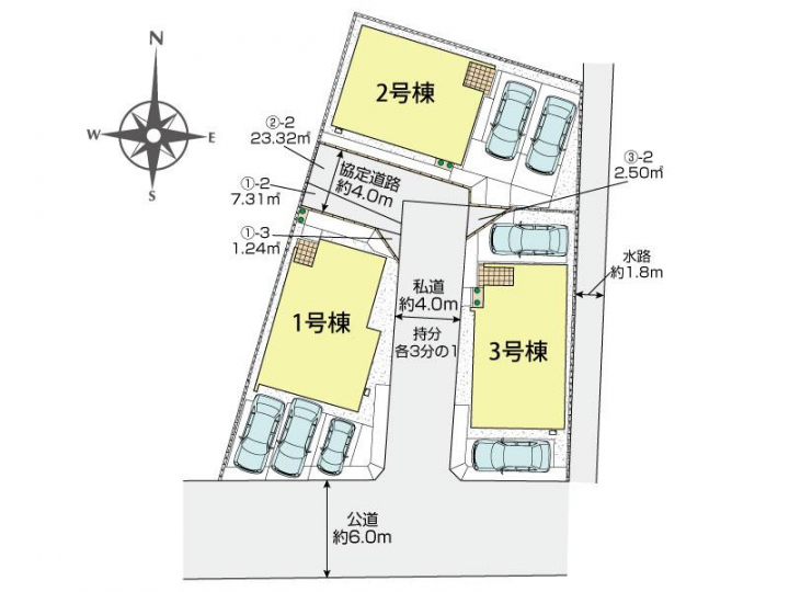 | 駐車場 | 3台 | 道路の幅員 | 南6.0m公道、東西4.0m私道 |