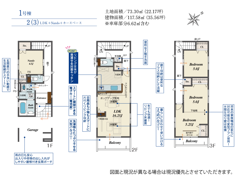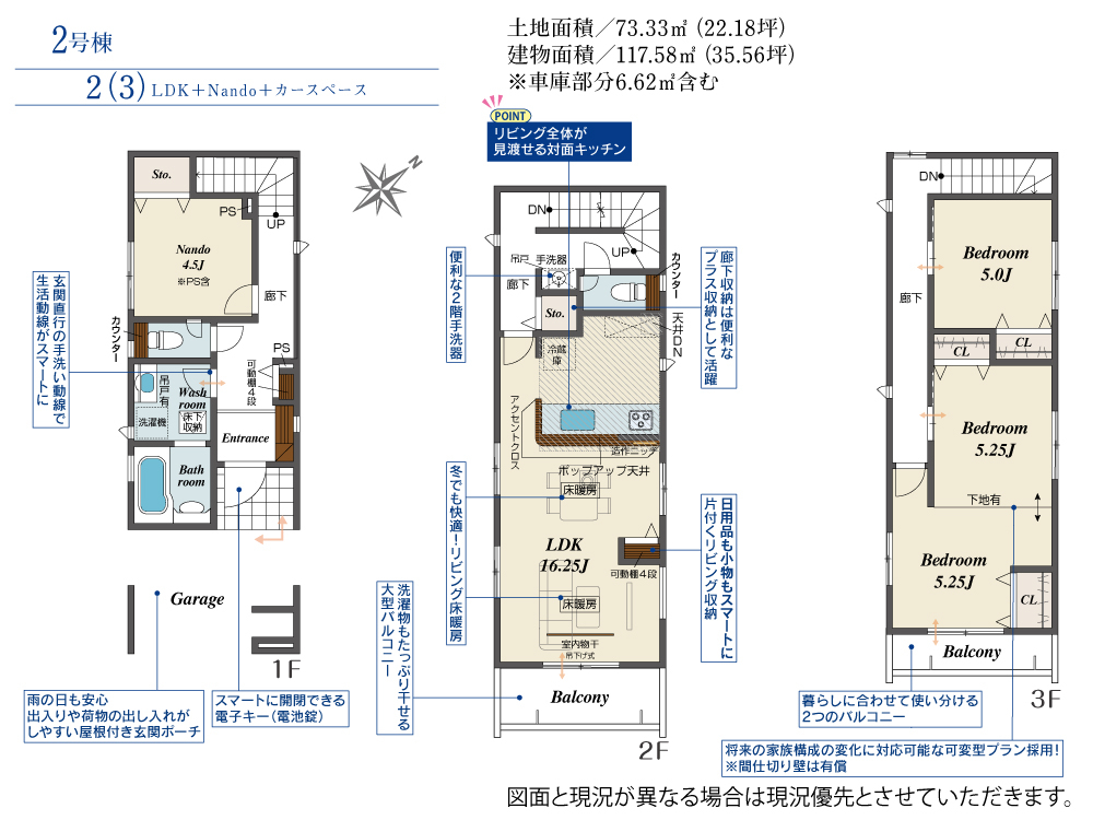 | 建物面積 | 117.58m2(約35.56坪) | 土地面積 | 73.30m2(約22.17坪)~73.58m2(約22.25坪) |