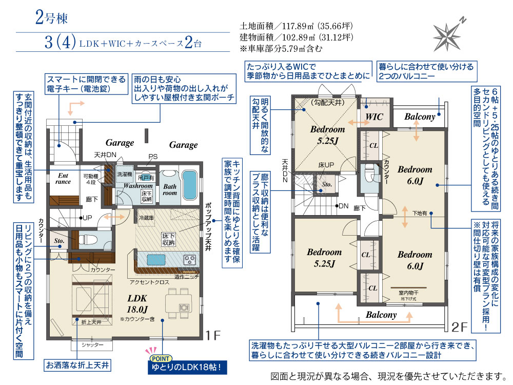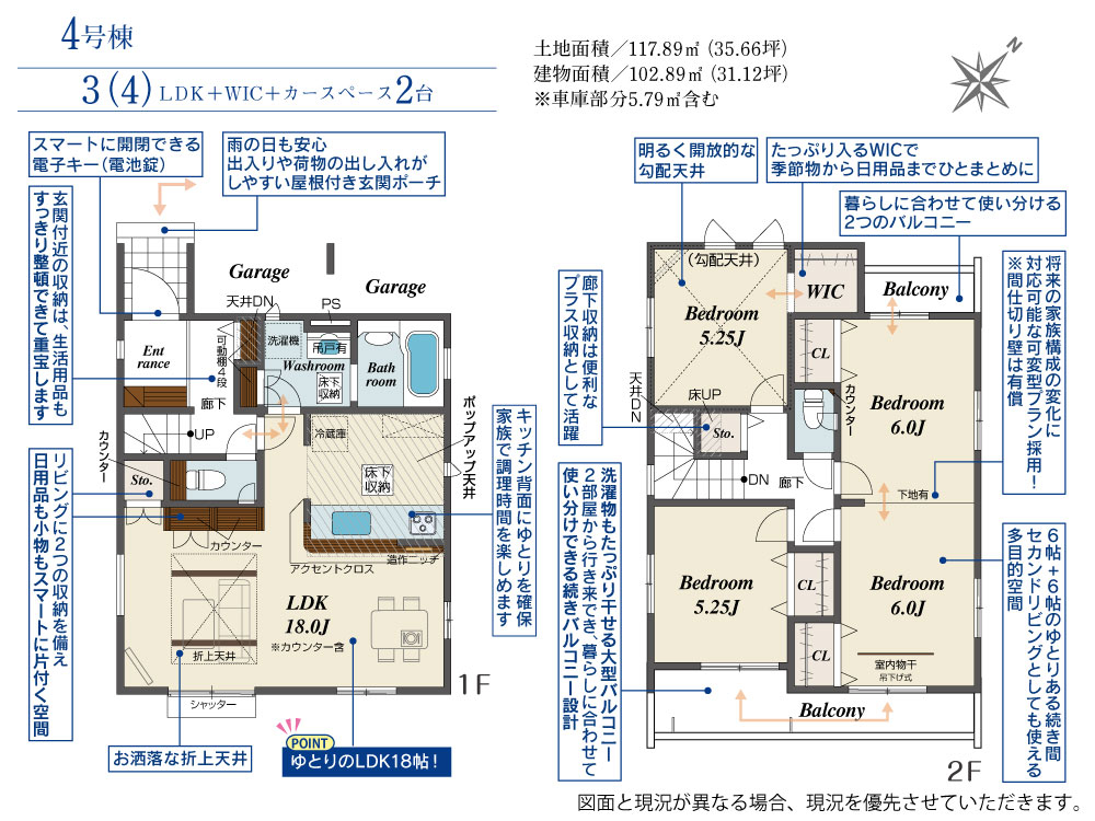 | 建物面積 | 102.89m2(約31.12坪)~106.28m2(約32.14坪) | 土地面積 | 117.89m2(約35.66坪)~118.30m2(約35.78坪) |