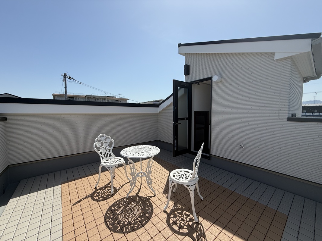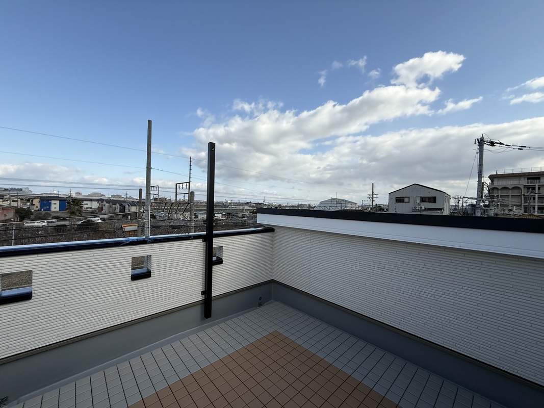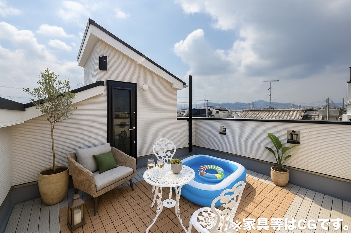 限られたスペースをどのように活かすかを追求した第一建設のベストスタンダードです☆外部からの視線も気になりにくいよう工夫を施しております。コンセントや水道蛇口も完備!広さは十分な6.9帖を用意し、普段の洗濯物を干すスペースだけではなく、お子様のプールやBBQ、憧れのグランピング利用など家族と過ごすもうひとつの屋上リビングになります。住んでからこういったスペースが欲しいと言っても叶えられない、第一建設オーナー様方、ご自慢の一部屋です。