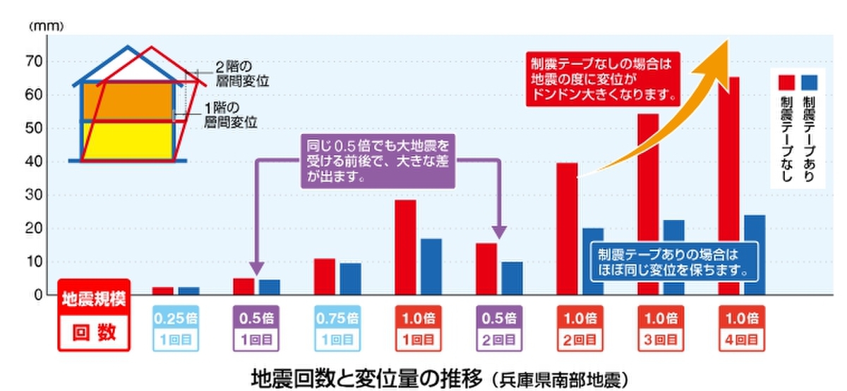 高層ビルの制震装置を木造住宅へ。制震テープは、高層ビルの制震装置に用いられている粘弾性体を、木造住宅用として両面テープ状に加工したもので、110年以上の高い耐久性を持っています。近年だけでも日本各地に多くの大地震が発生しています。日本中、いつ、どこで、大地震が起こるかわかりません。制震テープは地震エネルギーを吸収し、家全体をまるごと制振装置に変え、大地震時最大80%揺れを軽減します。