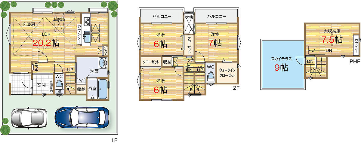 | 間取り | 3LDK、スカイテラス&屋根裏大収納庫 | 建物構造 | 木造2階、スカイテラス&屋根裏大収納庫 |