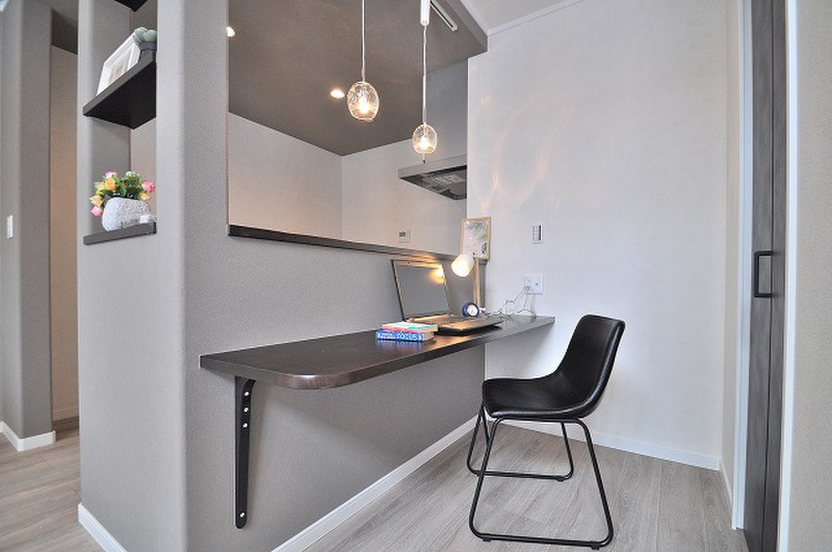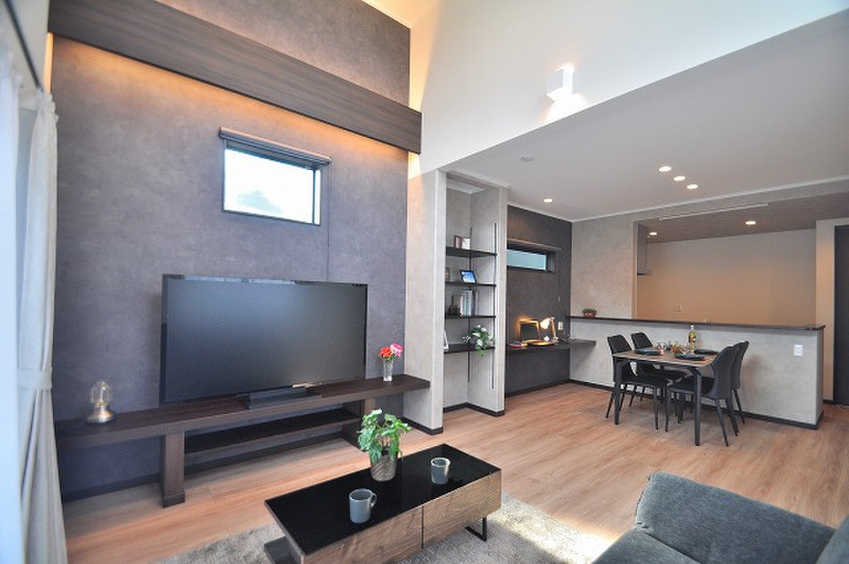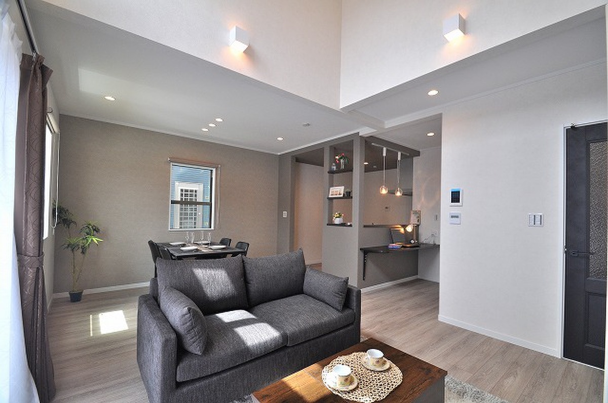 ■将来を見据えた「1階2LDK」&「2階3居室」の設計■建物はオール電化住宅、快適でエコな暮らしへ導く■上質なリビング風景を演出するダイナミックな吹抜■リモートスペースになるカフェカウンター