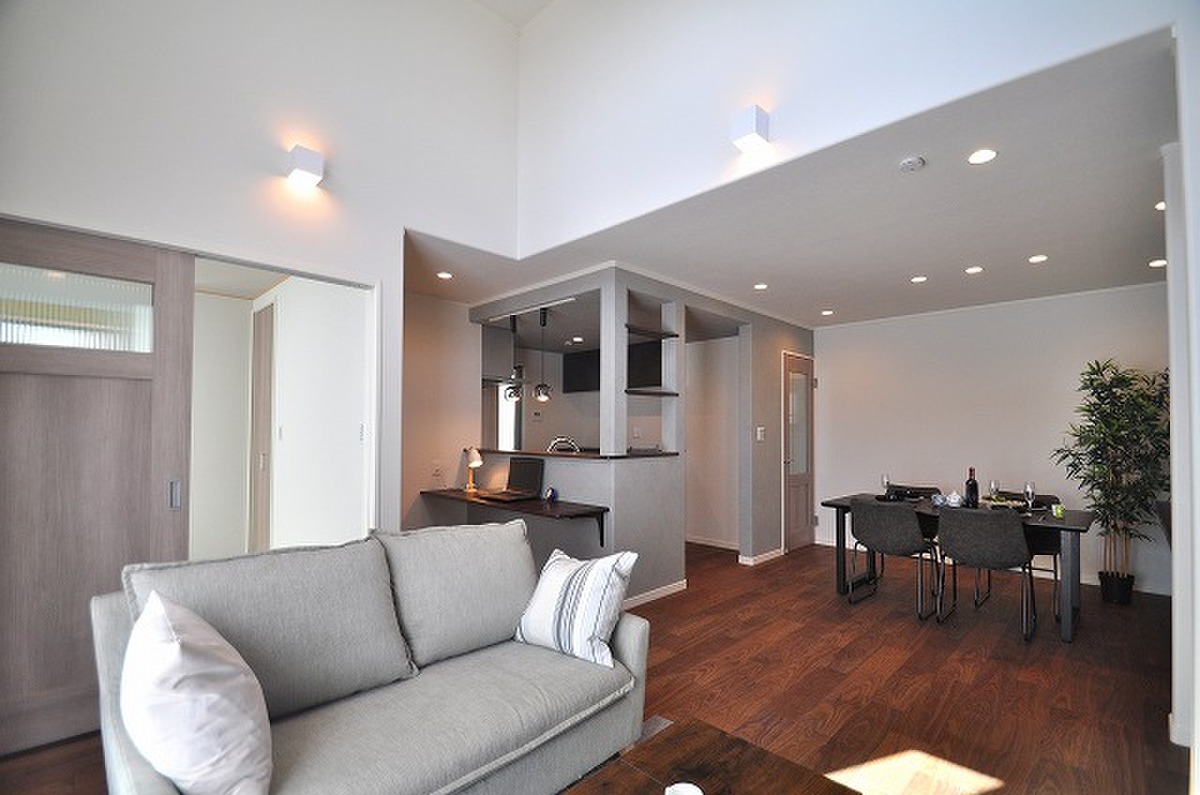 ■将来を見据えた「1階2LDK」&「2階3居室」の設計■建物はオール電化住宅、快適でエコな暮らしへ導く■上質なリビング風景を演出するダイナミックな吹抜■リモートスペースにもなるキッチンカウンター