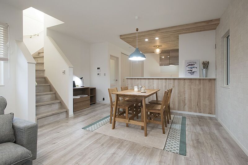 ■白を基調とした明るいリビングにグレーのキッチンがアクセントに♪ダクトレール付きだから、お好きなペンダントライトもお取り付けいただけます。