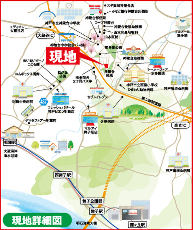 JR山陽本線「舞子」駅 バス約13分「南多聞台2丁目」停 徒歩7分~9分 JR山陽本線「朝霧」駅 バス約9分「神陵台小学校前」停 徒歩7分~9分 |