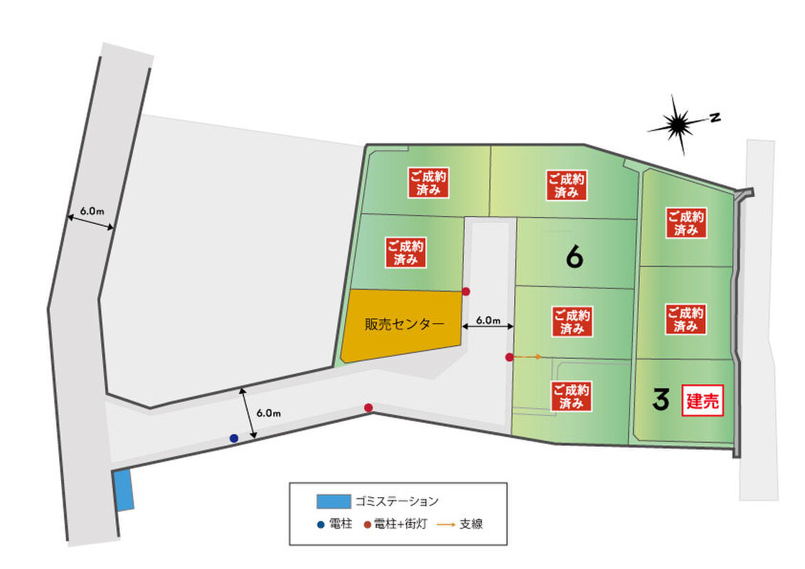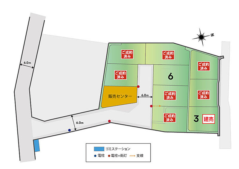 | 駐車場 | - | 道路の幅員 | 分譲地内道路幅6m、アスファルト舗装、私道負担あり(開発承認道路及び車両転回スペース共有持分1/7) |