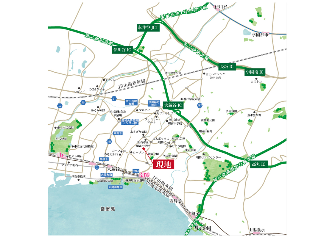 JR山陽本線「朝霧」駅 徒歩13分~14分 山陽電鉄本線「大蔵谷」駅 徒歩20分 |