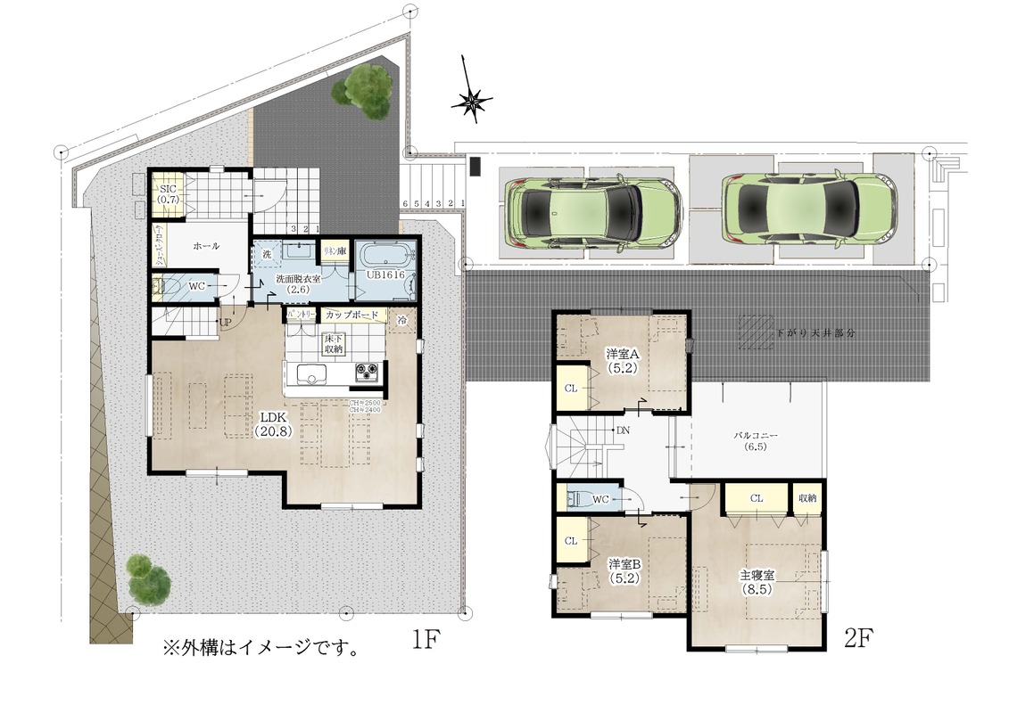 - ※完成予想図やCG合成画像は、門塀・植栽・庭・外観等、実際とは多少異なる場合があります。