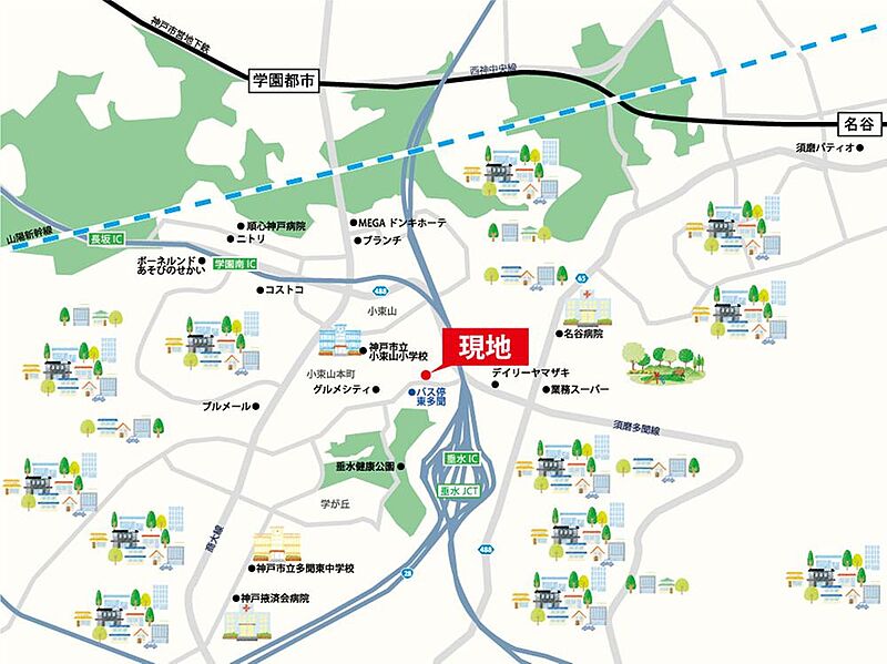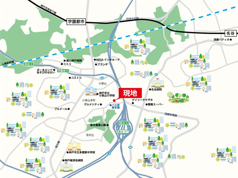 神戸市西神・山手線「学園都市」駅 山陽バス「東多聞」停 約350m 徒歩4分 神戸市営地下鉄「学園都市」 バス「東多聞」より乗車後14分 |