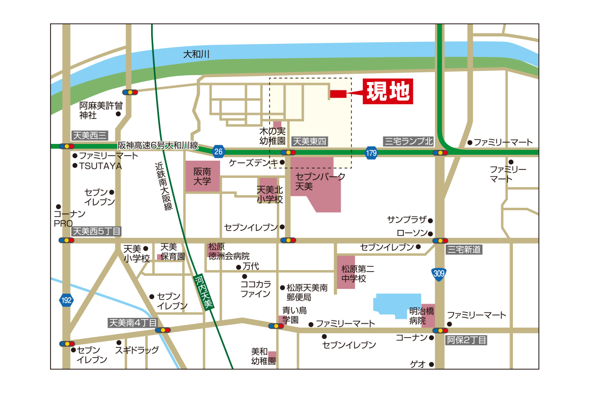 近鉄南大阪線「河内天美」駅 徒歩22分~23分 (自転車であれば約6分) Osaka Metro御堂筋線「あびこ」駅 北港観光バス あびこ天美線19分「天美北2丁目」バス停 徒歩3分~4分 |