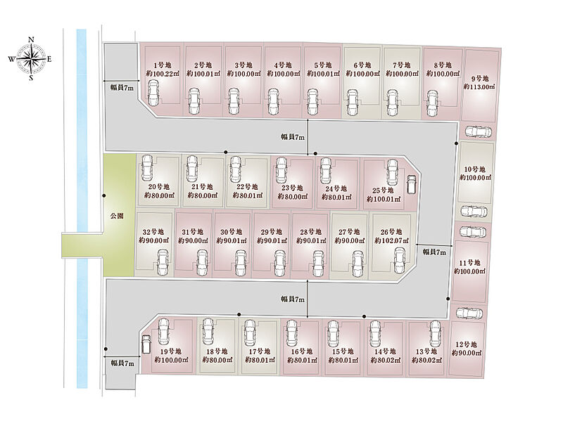| 建物面積 | 90.91m2~103.25m2 | 土地面積 | 80.00m2~113.00m2(32区画) |