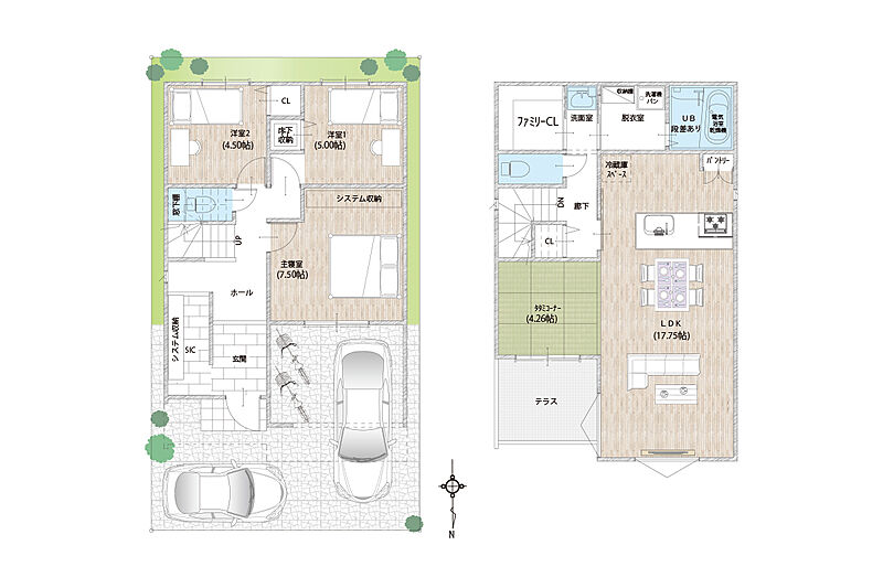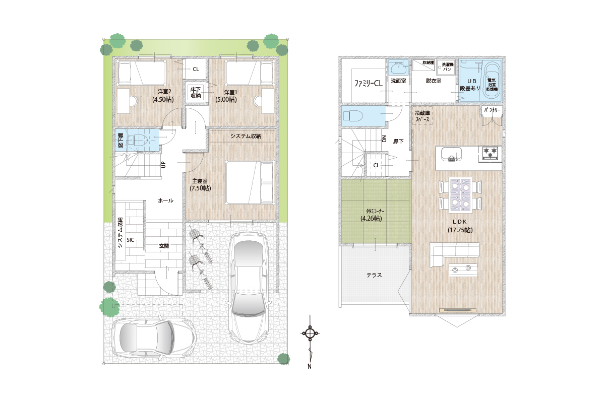 - ※完成予想図やCG合成画像は、門塀・植栽・庭・外観等、実際とは多少異なる場合があります。