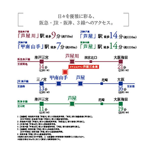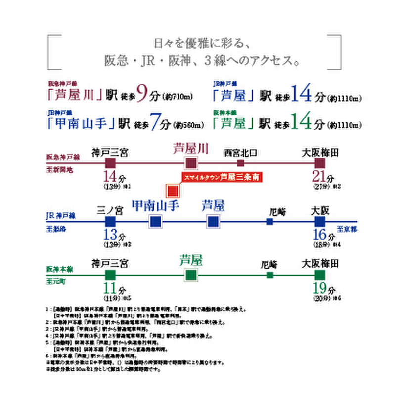 阪急神戸本線「芦屋川」駅 徒歩9分 JR東海道・山陽本線「甲南山手」駅 徒歩7分 JR東海道・山陽本線「芦屋」駅 徒歩14分 |