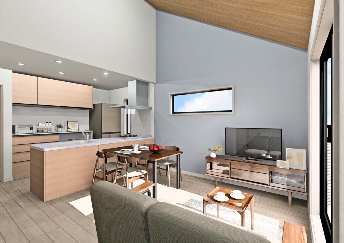 ●リビングは勾配天井が空間の広がりを演出しゆったりと寛ぎの空間