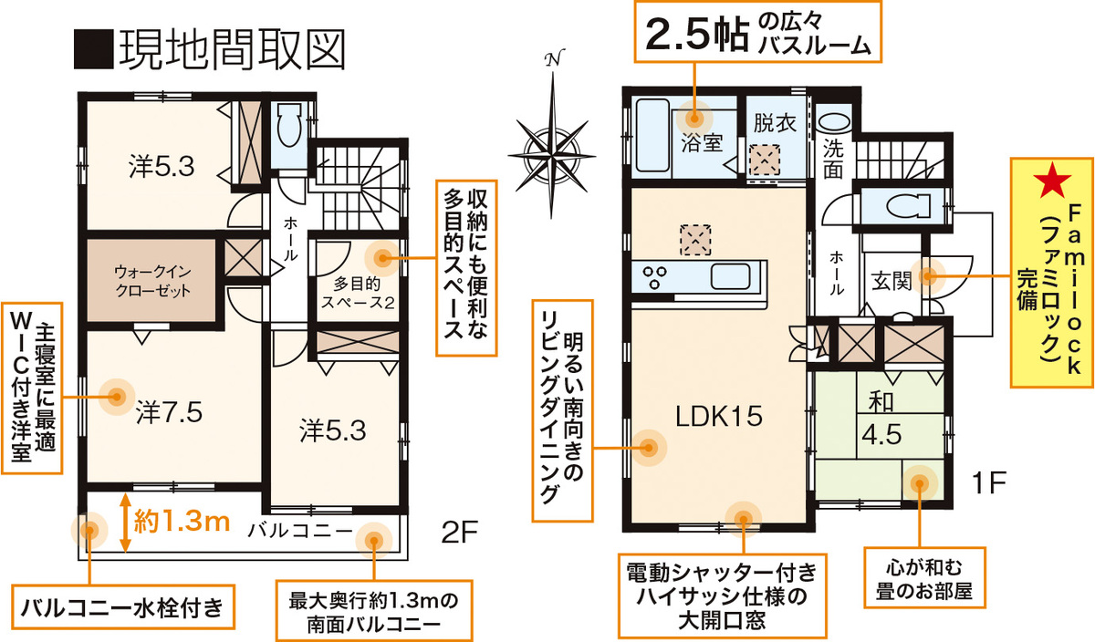 【間取りの特徴】■LDKと和室、間仕切りを開放すれば約21.5帖に■全居室収納付き、居住空間も広々使えます■ゆとりの1.25坪バスルームで日々の疲れを癒します■2階洋室7帖にはW.I.Cと納戸がござい
