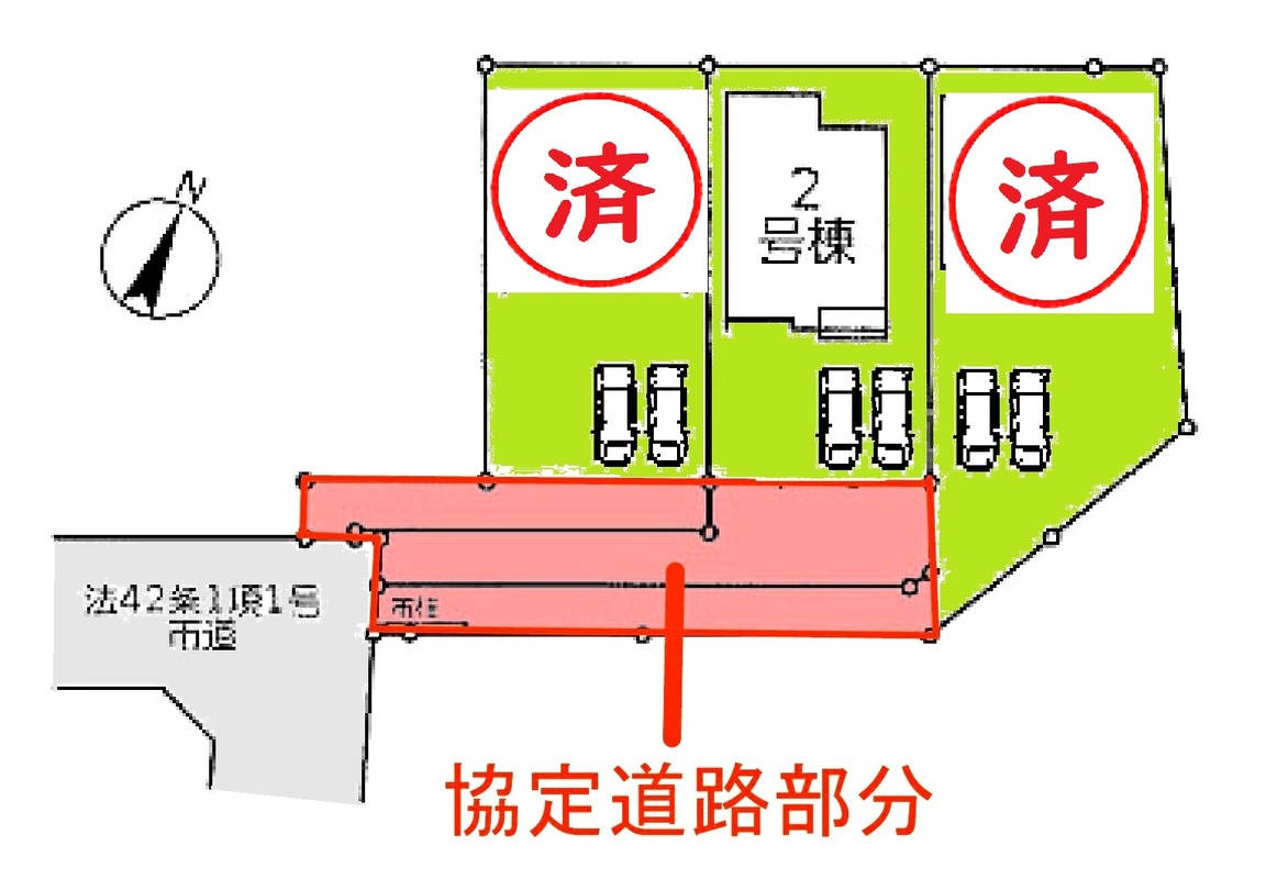 | 駐車場 | 2台(車種による) | 道路の幅員 | 道路幅:6m、アスファルト舗装 |