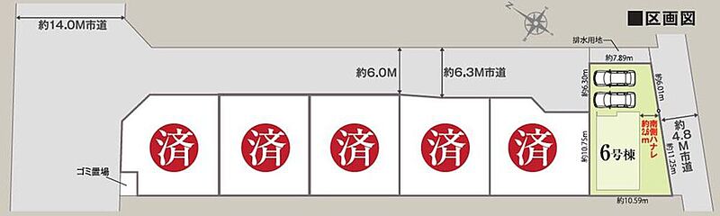 | 駐車場 | 2台 | 道路の幅員 | 道路幅:4.7m~6.3m、アスファルト舗装、南東:4.7m 北西:6.3m |