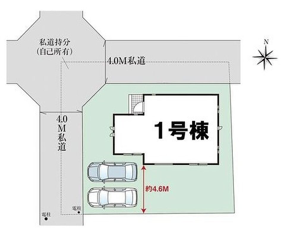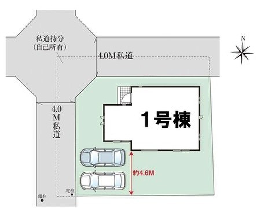 | 駐車場 | 2台(車種による) | 道路の幅員 | 道路幅:4m、アスファルト舗装、(北4m私道、西4m私道) |