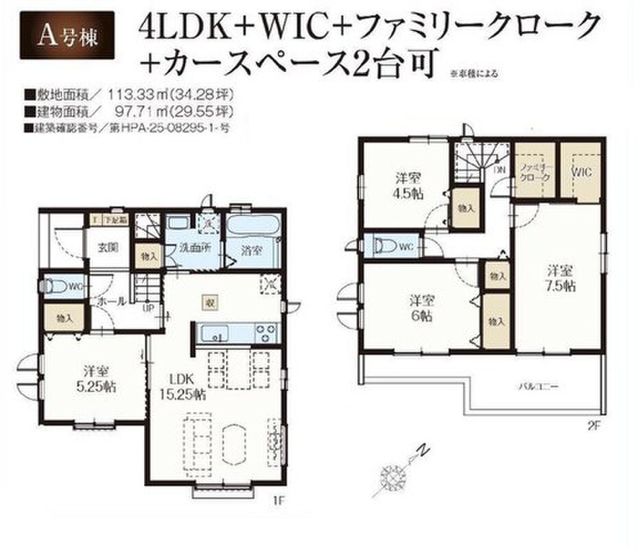 全洋室、水廻り集中設計、ファミリークローク、WIC、2階ホール物入、ワイドバルコニー、駐車2台可能等!
