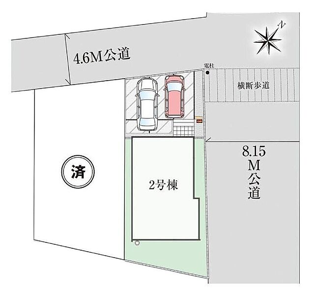 | 駐車場 | 2台(車種による) | 道路の幅員 | 道路幅:4.6m・8.1m、アスファルト舗装、(北東8.15m公道、北西4.6m公道) |
