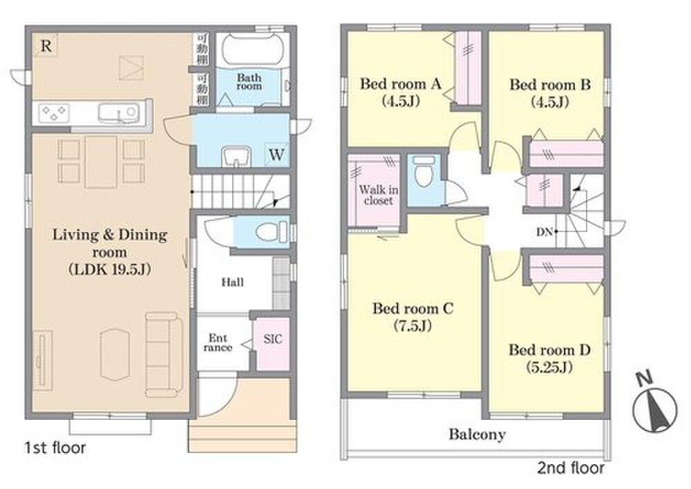 南向き、全洋室、リビングイン階段、ファミリークローゼット、WIC、SIC、2階ホール物入、南面バルコニー、駐車2台可能等