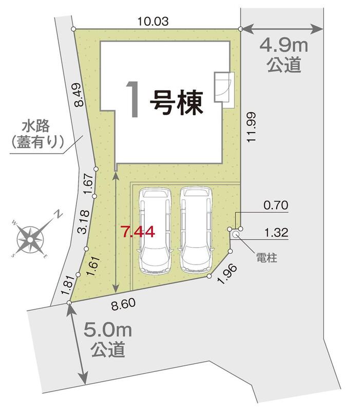 | 駐車場 | 2台(車種による) | 道路の幅員 | 道路幅:4.9m・5m、アスファルト舗装、(南東5m、北東4.9m) |