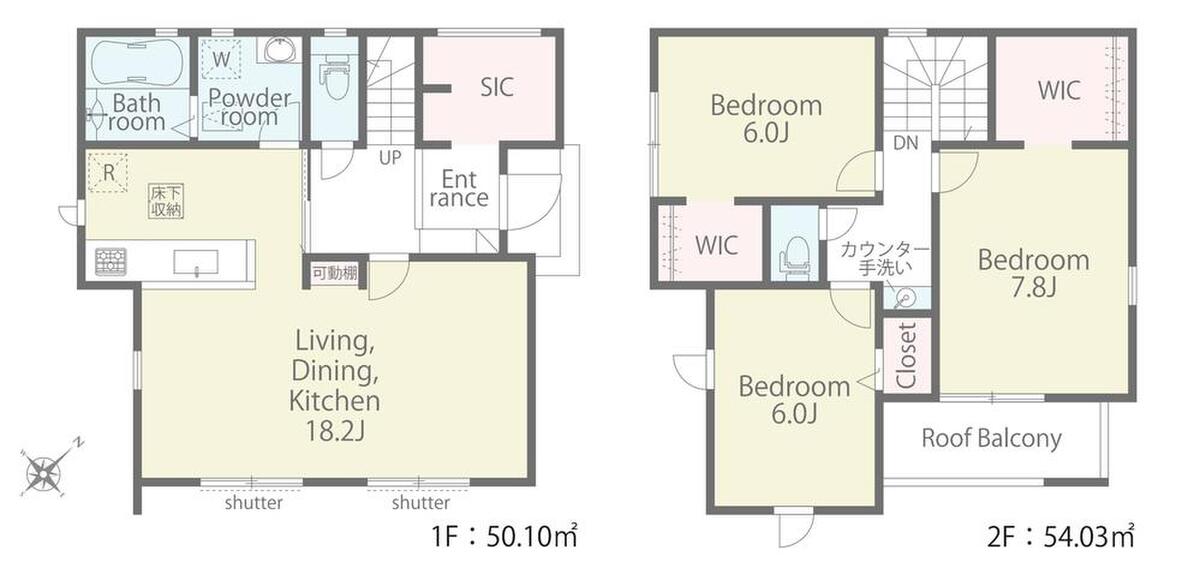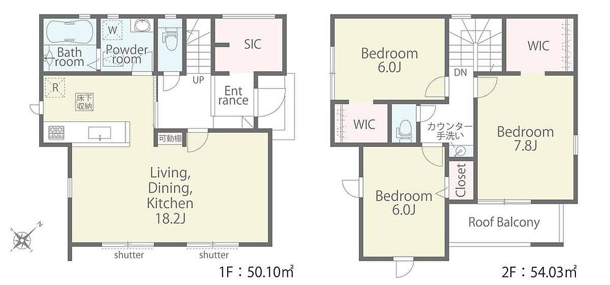 水廻り集中設計、浴室乾燥機、WIC×2、SIC、LDK可動棚、2階手洗いカウンター、インナーバルコニー、庭、駐車2台可能等