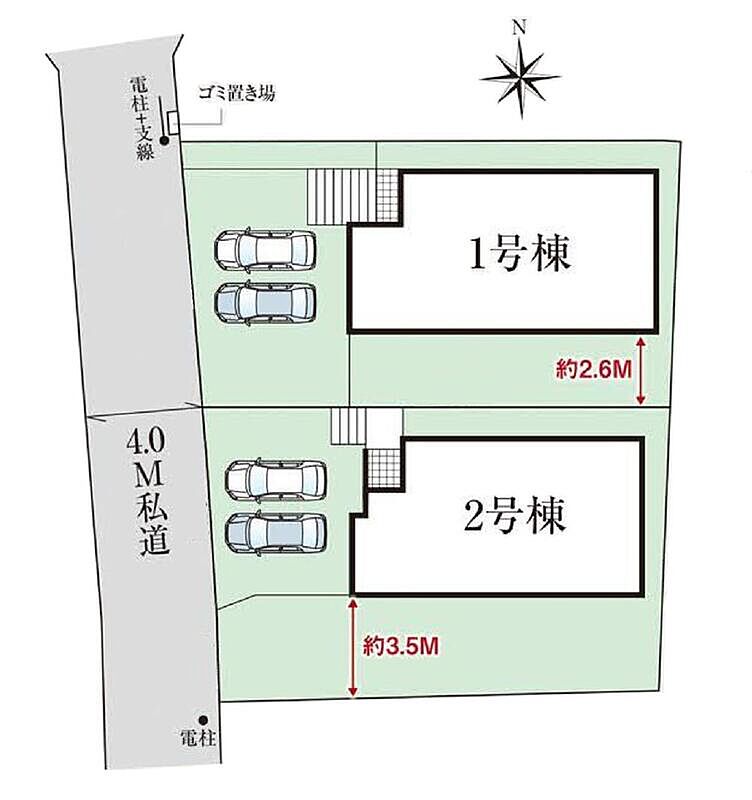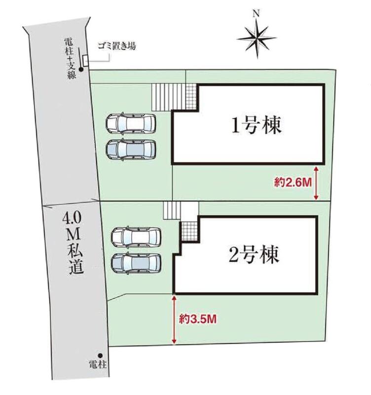 | 駐車場 | 2台(車種による) | 道路の幅員 | 道路幅:4m、アスファルト舗装、( 西 4m 私道) |