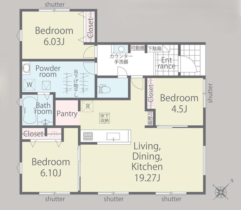 平屋、全洋室、食洗機、浴室乾燥機、LDK19帖、吊下げ物干し、玄関手洗いカウンター、