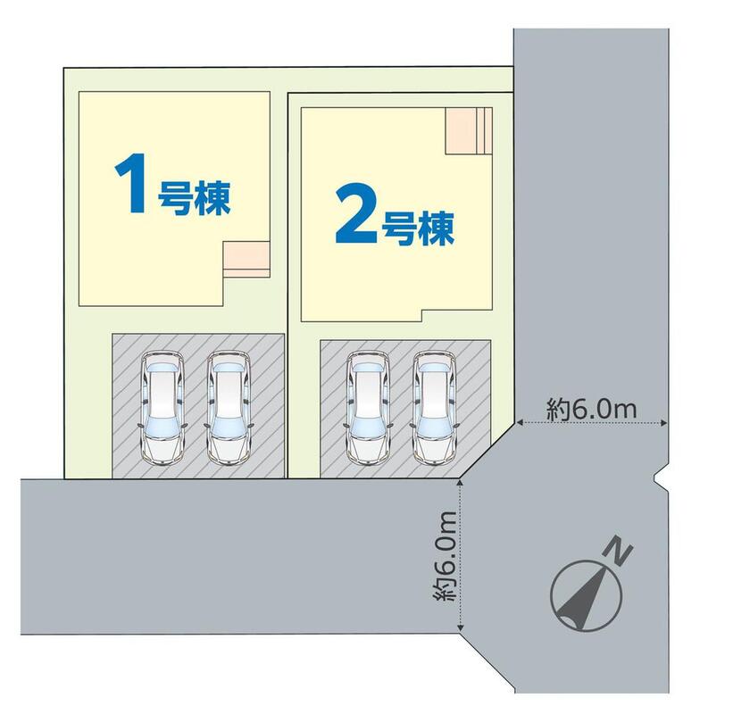 | 駐車場 | 2台(※車種による) | 道路の幅員 | 道路幅:6m、アスファルト舗装、(南東側6m公道、北東側6m公道) |