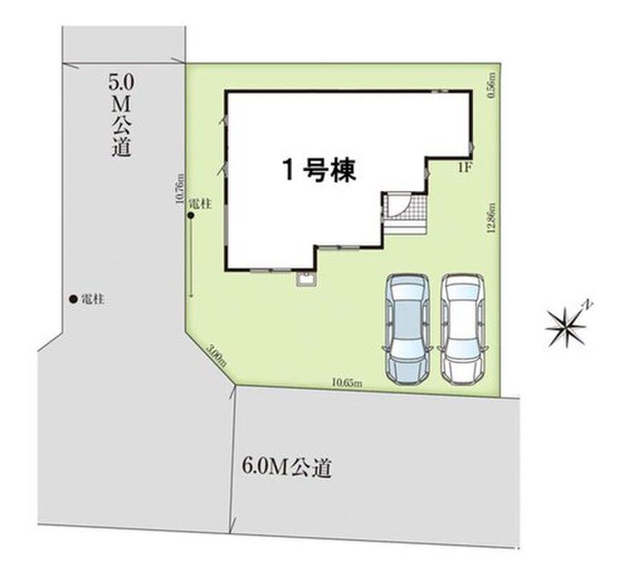 | 駐車場 | 2台(車種による) | 道路の幅員 | 道路幅:5m・6m、アスファルト舗装、(南東6.01m公道、南西5.02m公道) |