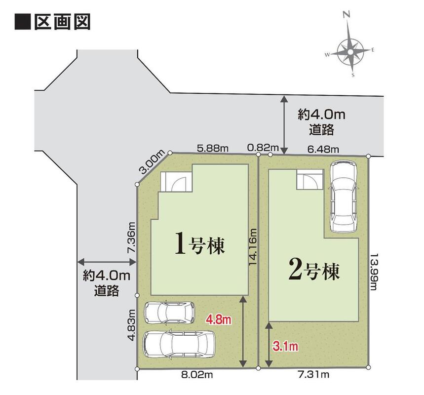 | 駐車場 | 1台 ~ 2台(1号棟(2台/車種による)2号棟(1台)) | 道路の幅員 | 道路幅:4m、アスファルト舗装 |