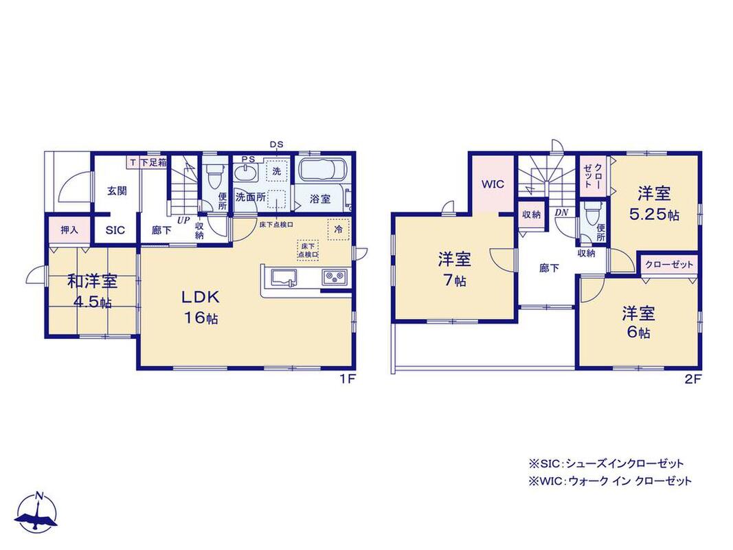 南向き、水廻り集中設計、浴室乾燥機、和洋室、WIC、SC、2階ホール物入