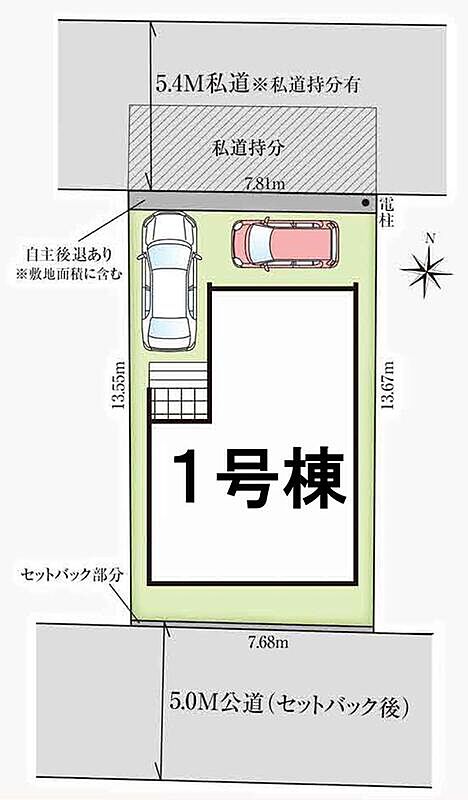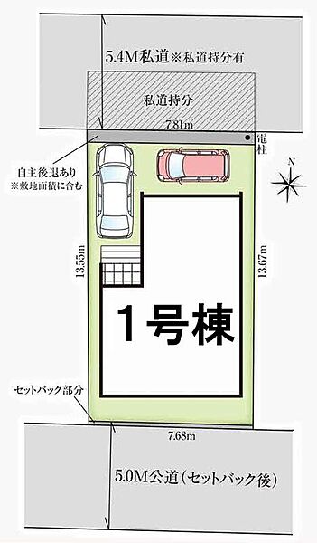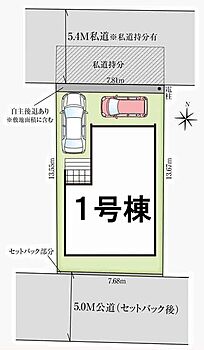 | 駐車場 | 2台(車種による) | 道路の幅員 | 道路幅:5m・5.4m、アスファルト舗装、(北5.45m私道、南5.01m公道) |