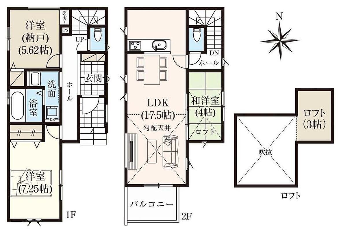 南向き、浴室乾燥機、2階リビング、和洋室、納戸、ロフト、吹抜、南面バルコニー、カースペース1台分等!