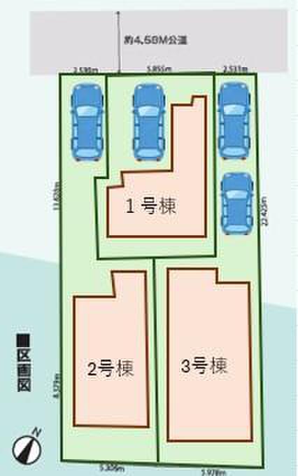 | 駐車場 | 1台 ~ 2台(1号棟(1台)・2号棟(1台)・3号棟(2台)) | 道路の幅員 | 道路幅:4.5m、アスファルト舗装、北西 4.58m 公道 |