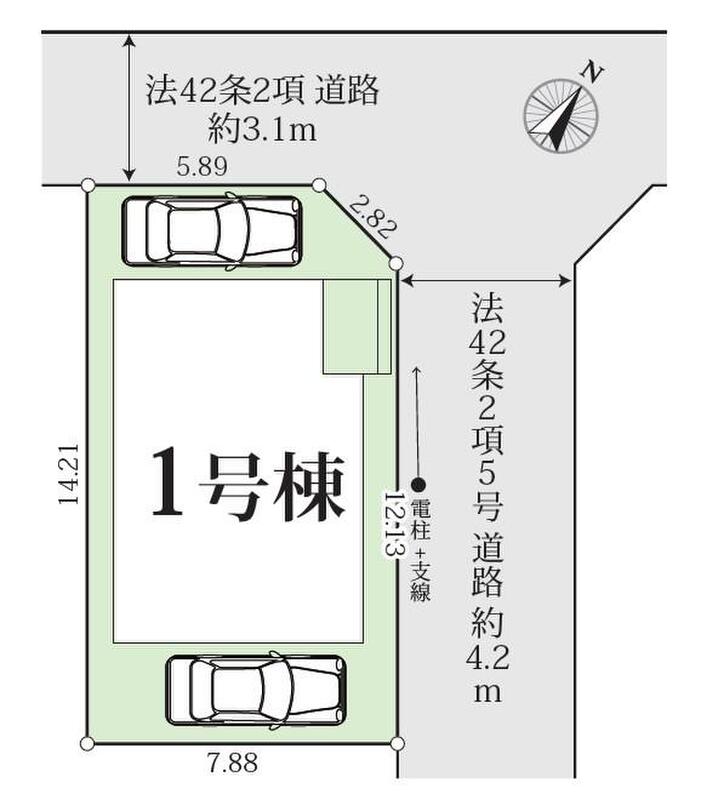 | 駐車場 | 2台 | 道路の幅員 | 道路幅:3m・4.2m、アスファルト舗装、北西側3m公道、北東側4.2m私道 |