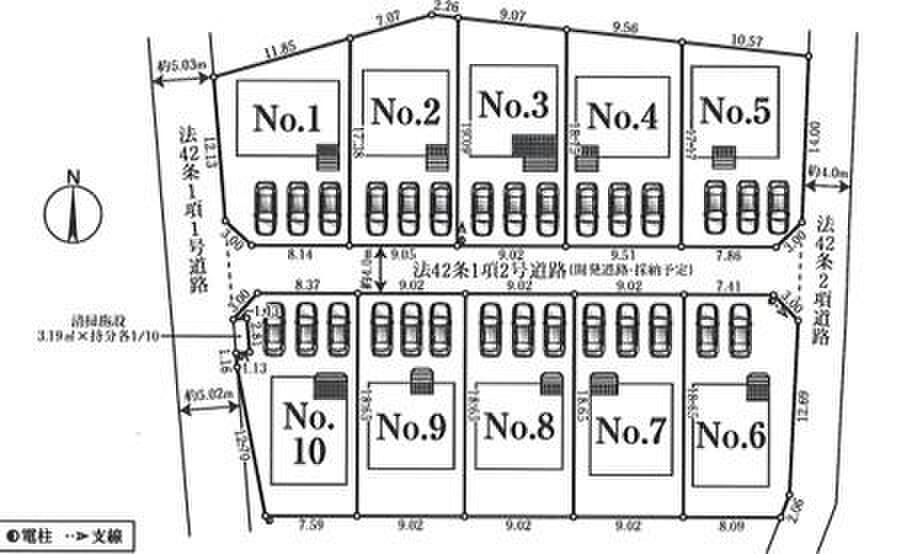 | 駐車場 | 2台 ~ 3台(2台(1戸)、3台(8戸)) | 道路の幅員 | 道路幅:4m~5m、アスファルト舗装、西側約5m公道、東側約4m公道、約4m開発道路(採納予定) |