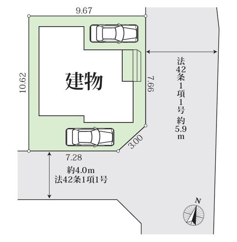 | 駐車場 | 2台 | 道路の幅員 | 道路幅:4m・5.9m、アスファルト舗装、南側4m公道、東側5.9m公道 |