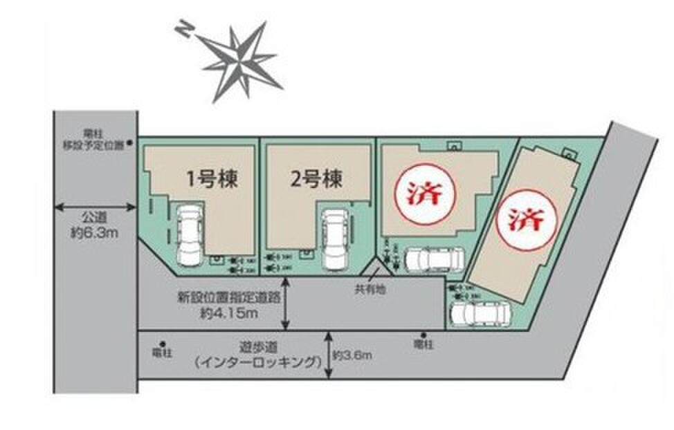 | 駐車場 | 1台 | 道路の幅員 | 道路幅:4.1m・6.3m、アスファルト舗装、南西側4.15m私道、北西側6..3m公道 |