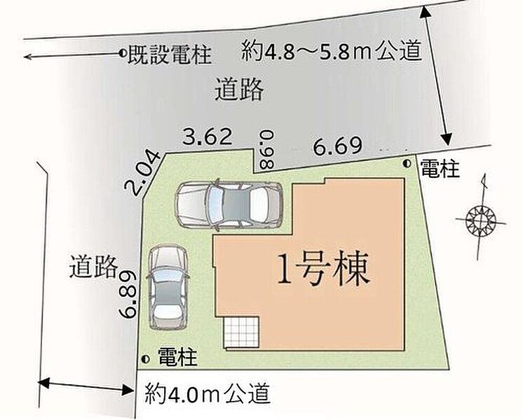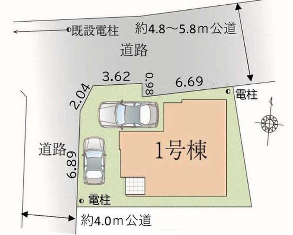 | 駐車場 | 2台 | 道路の幅員 | 道路幅:4m~5.8m、アスファルト舗装、西側4m公道、北側4.8~5.8m公道 |